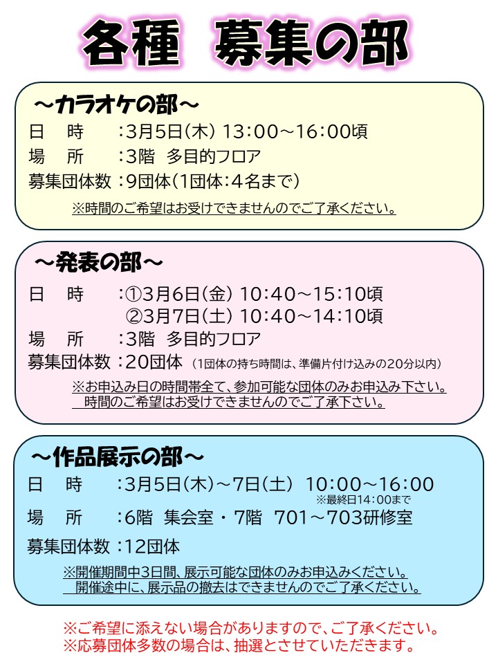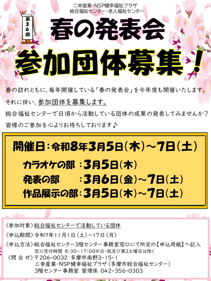 それに伴い、参加団体を募集します。総合福祉センターで日頃から活動している団体の成果を発表してみませんか?