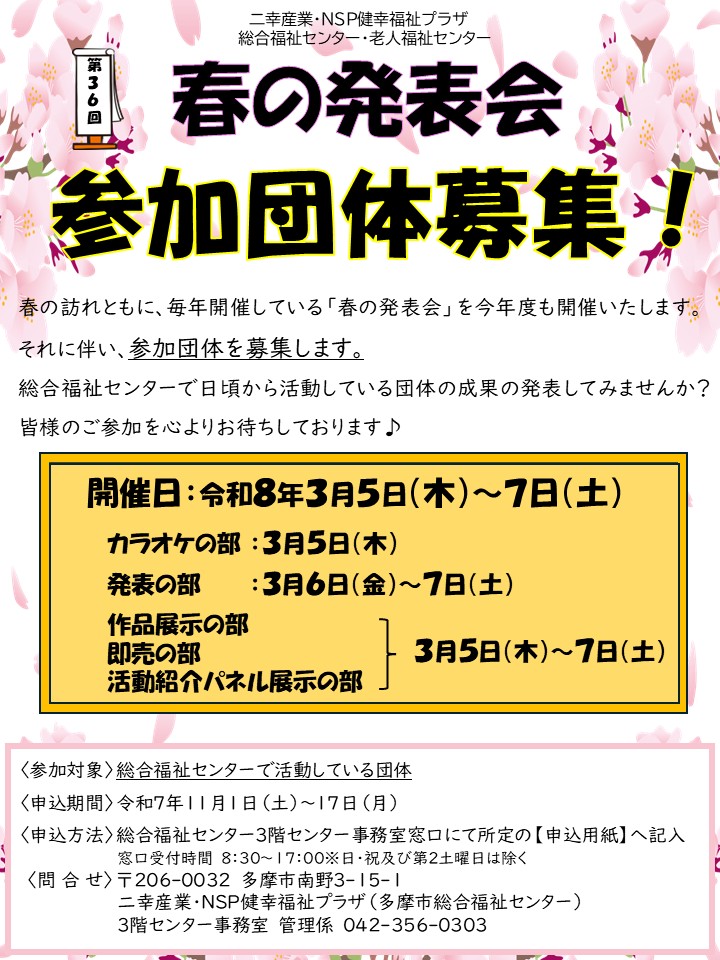 それに伴い、参加団体を募集します。総合福祉センターで日頃から活動している団体の成果を発表してみませんか?