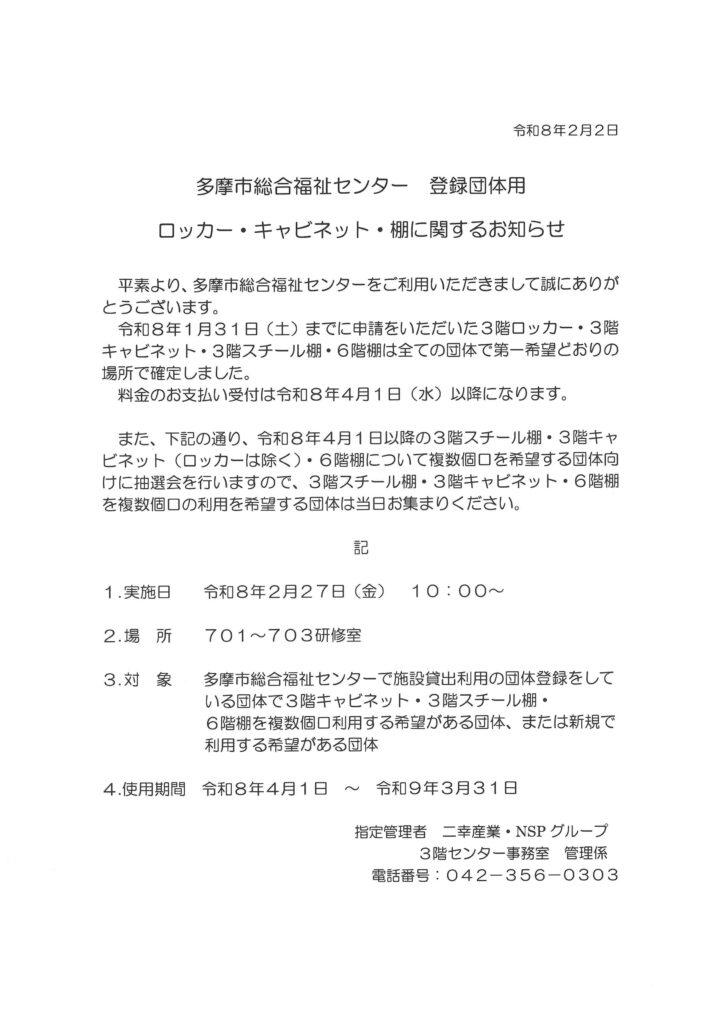 二幸産業・NSP健幸福祉プラザ(多摩市総合福祉センター)3F センター事務室 管理係