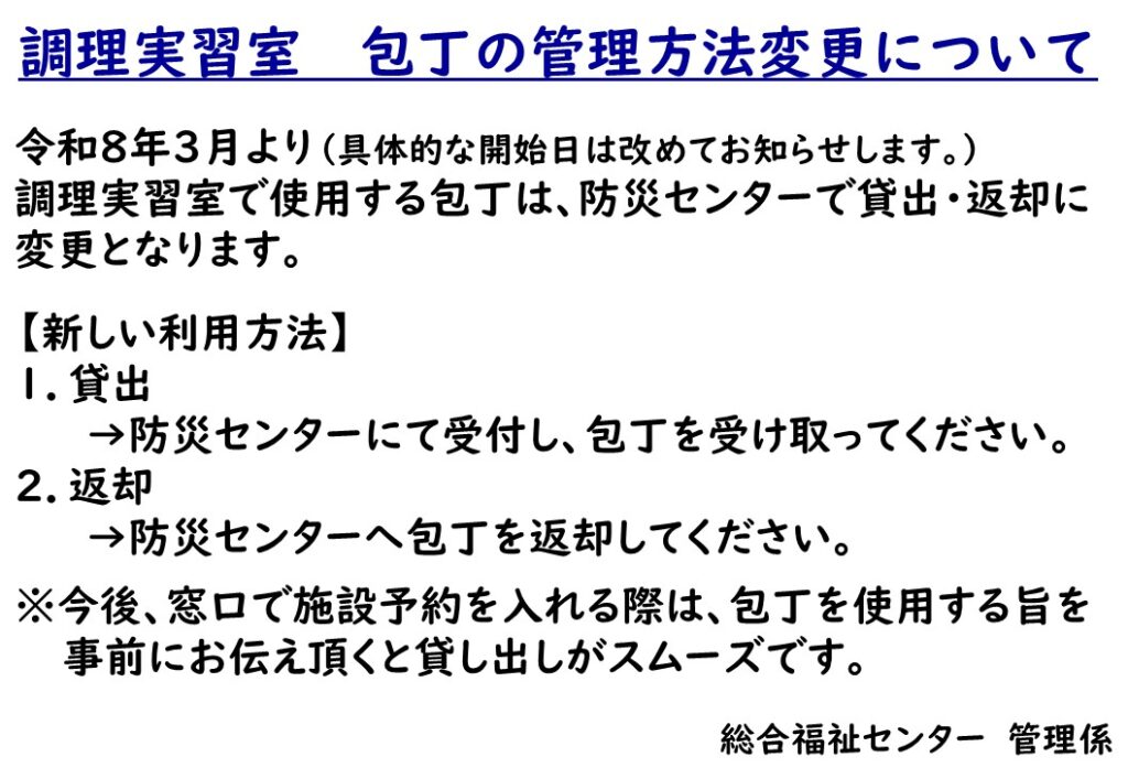 重要2026年2月24日 調理実習室 包丁の管理方法変更について 【お問合せ】 〒206ー0032 多摩市南野3-15ー1 二幸産業・NSP健幸福祉プラザ(多摩市総合福祉センター)3F センター事務室 管理係 電話:042ー356-0303 ※日・祝及び第2土曜日を除く8時30分~17時